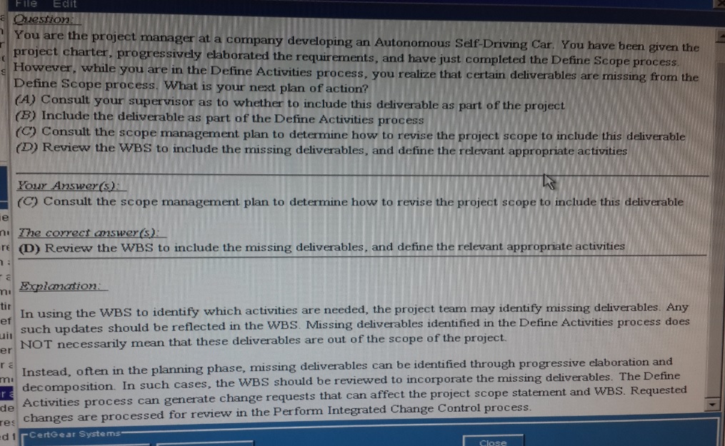 You miss understand the question No.1. The question says ..you realize that certain deliverable are missing from the define scope process... Here missing from the define scope process means not disaapeared. Totally forgotten to consider into Scope.