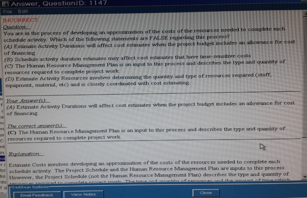 You are in the process of developing and approximation of the cost of the resources needed to complete each schedule activity. Which of the following statements are false regarding the process? (correct answer is 3)